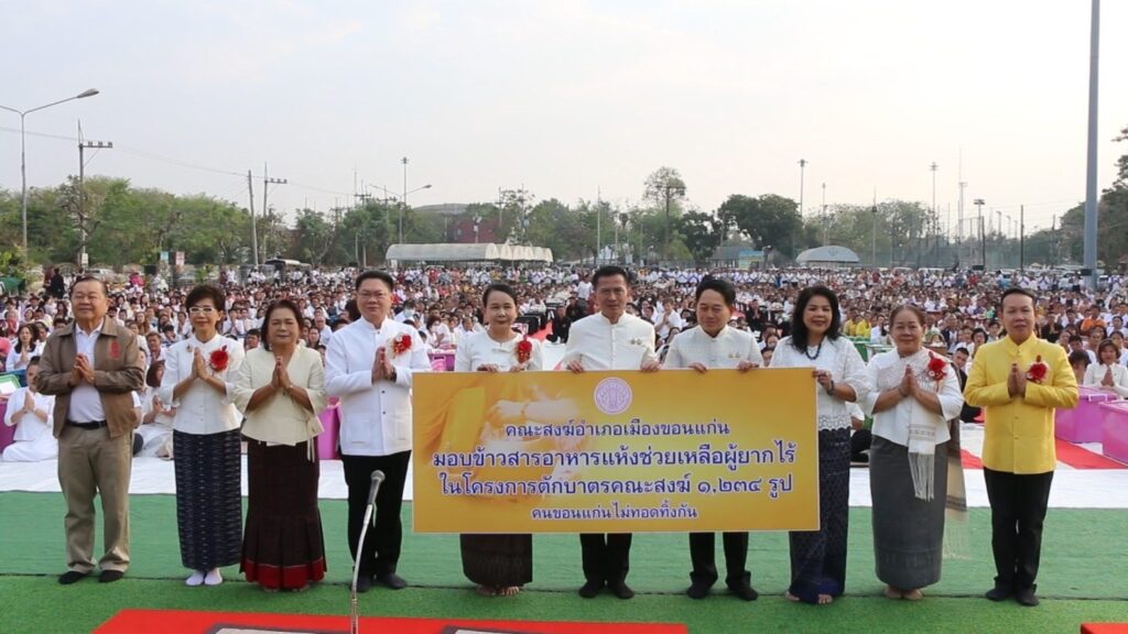 ชาวขอนแก่นกว่า 1,000 คน ร่วมกันสร้างมหาทาน ทำบุญตักบาตรพระสงฆ์ สามเณร 1,234 รูป ในโครงการ “ร่วมใจตักบาตรเพื่อผู้ยากไร้ คนขอนแก่นไม่ทอดทิ้งกัน” เพื่อนำปัจจัย ข้าวสาร อาหารแห้ง สมทบกองบุญช่วยเหลือผู้ยากไร้ในจังหวัดขอนแก่น